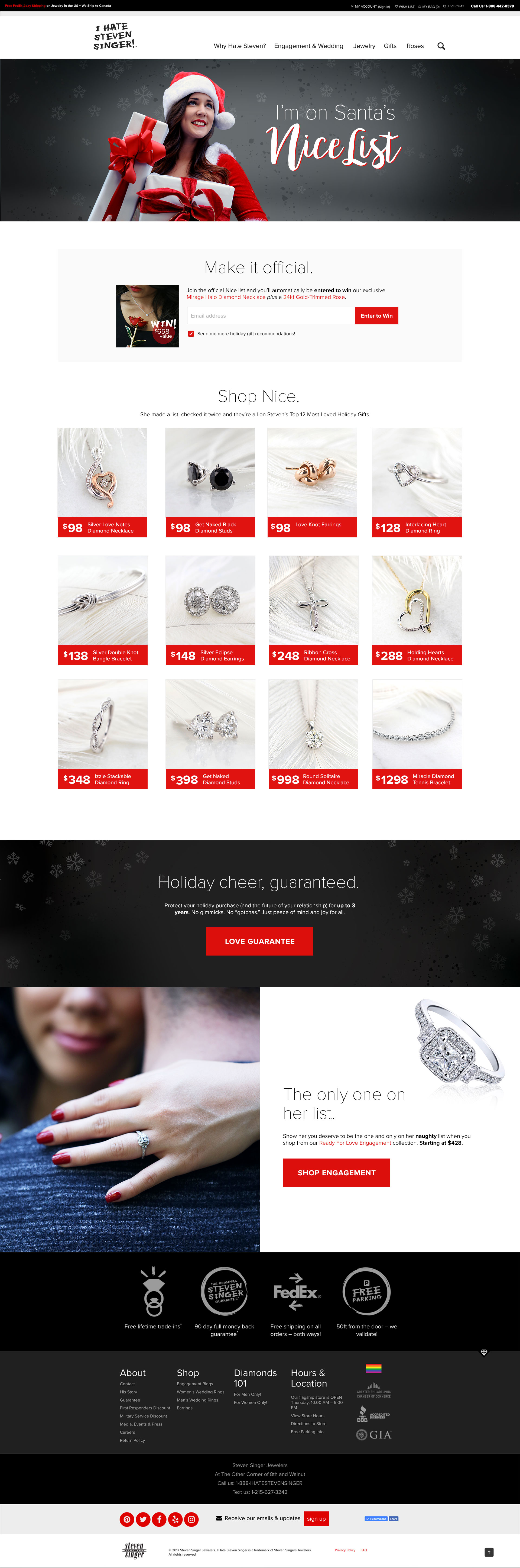 A particular campaign worth noting was for the 2017 holiday season. Putting a Steven Singer twist on the traditional idea of a naughty and nice Christmas list, the team and I went with an integrated digital approach that included a website takeover, email, social and display ads that enabled us to fulfill on three goals: grow the email list, increase sales and engage users on social.